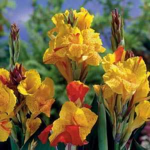 Canna Cleopatra is a herbaceous perennial closely related to banana and bird of paradise. It produces dark green foliage marked with bronze-red variegation. This variety has yellow-lemon flowers and is dotted with orange/red. Also bees butterflies moths and hummingbirds are attracted to Canna flowers.