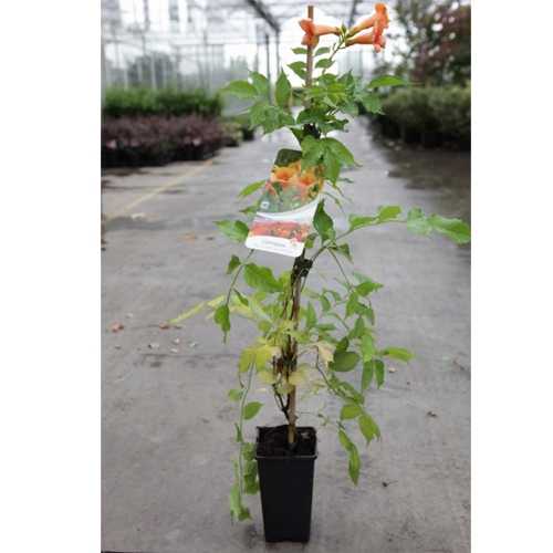 Campsis Tagliabuana Madame Galen is a lovely deciduous climbing plant with attractive orange/red coloured blooms in the late summer.