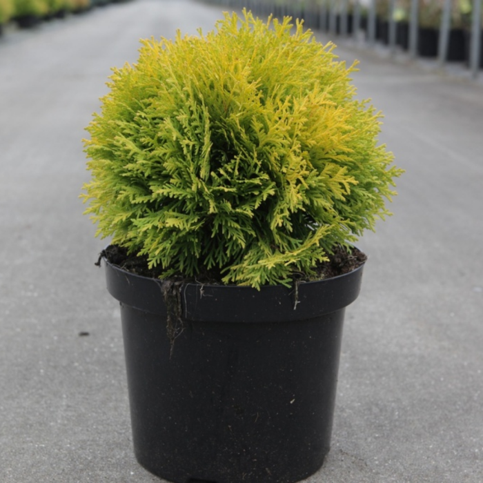 Thuja Occidentalis Amber Glow is a dense, slow-growing evergreen plant with a round habit. It has very bright green, yellow foliage in the spring and summer that gradually develops a bronze tinge during the Autumn and Winter.