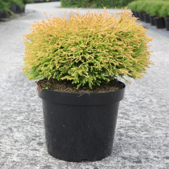 Thuja Occidentalis Golden Tuffet is a dwarf growing conifer with a pillow like habit. Which has beautiful yellow spring foliage maturning to bronze orange with hints of bright lime. Ideal for rockery gardens or front of borders.