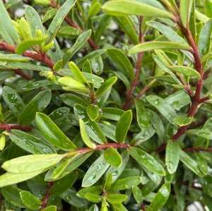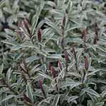 Hebe Tricolor is a bushy, evergreen shrub with glossy green leaves with cream margins and purple-red edges. It produces red-purple flowers July-December.