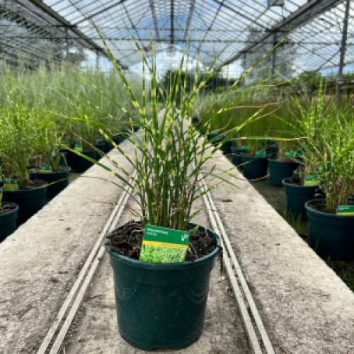 This is a graceful fountain grass producing horizontal golden yellow bands on the leaves. Striking, silky finger like flowers bloom in late summer.