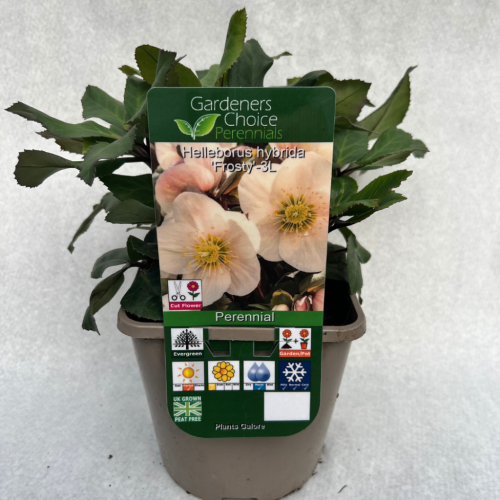 Helleborus hybrida 'Frosty' is a clump-forming evergreen perennial with large white flowers that bloom in winter and spring. It thrives in clay or sandy, moist soil. it prefers partial shade to full shade. Reaches 45cm in height and width, adding bold colour to shaded areas.