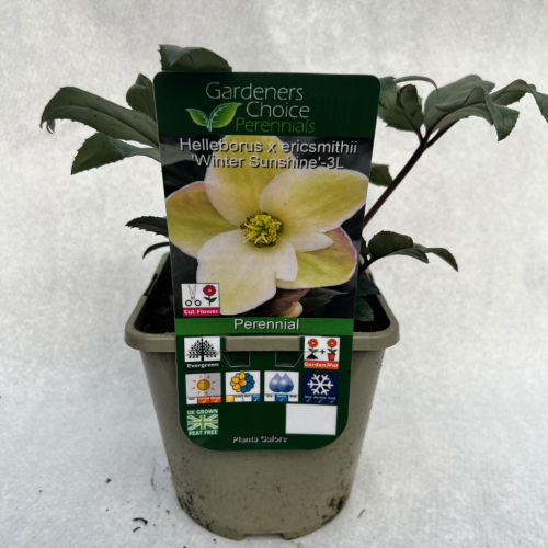 Helleborus x ericsmithii 'Winter Sunshine' is a clump-forming, semi-evergreen perennial that reaches up to 45 cm in height, featuring glossy dark olive-green leaves with pewter-grey veins. Its large flowers bloom from late winter to early spring, showcasing green centres and long creamy stamens. The petals initially open creamy-white and gradually transform to a pinkish-red as they age.