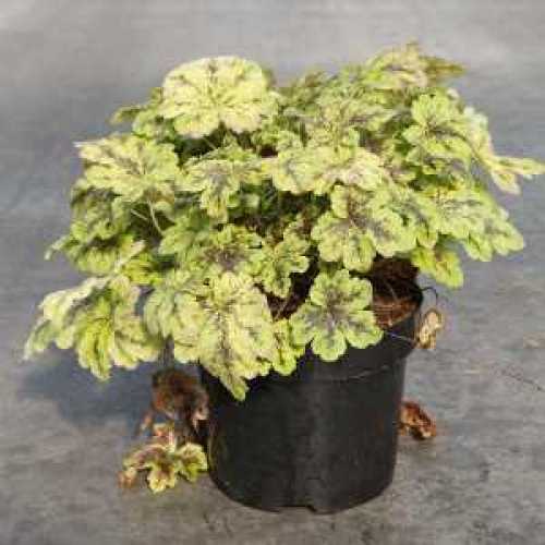 Solar Power is a clump-forming, evergreen perennial, with lobed yellow-green leaves mottled with dark red. Upright sprays of small, white bell-shaped flowers appear from Spring.