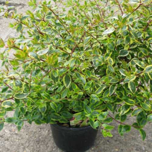 Abelia Grandiflora Sunshine Daydream is an evergreen shrub with small tricolour leaves with shades of pink golden yellow and green. It produces fragrant white blooms with rosy tones between Spring and Autumn.