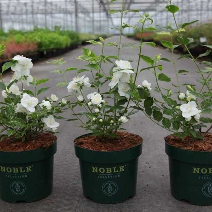 Philadelphus Innocence is a bushy, deciduous shrub. It has dark green leaves that are splashed with yellow, which sit on arching branches. During the early summer, it is adorned with saucer shaped, white flowers that are very fragrant. RHS Award of Garden Merit.