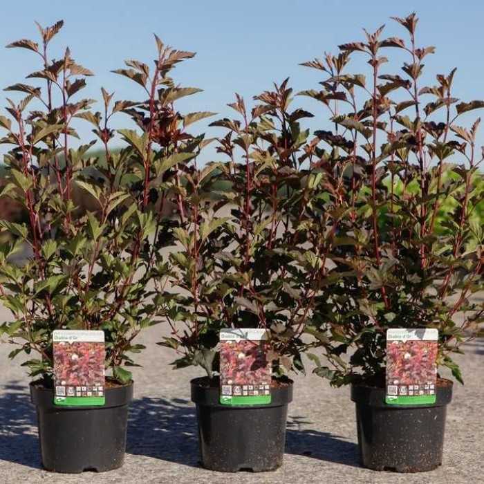 Physocarpus 'Diable D'Or' (NinebarK) is a hardy deciduous shrub grown for its rich dark foliage burnished gold when young and pink flowers which appear in early summer. Suited to a shrub border.