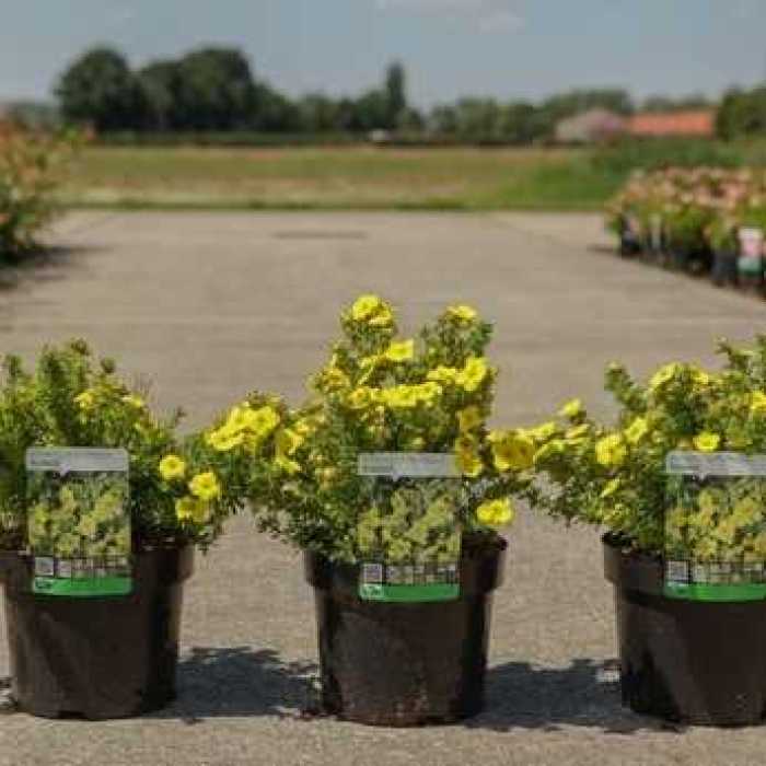 Potentilla Fruticosa Kobold is a compact bushy deciduous shrub with mid- to grey-green leaves. In the summer produces bright yellow flowers with overlapping petals.