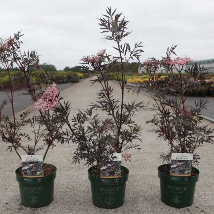 Sambucus Nigra Black Lace (Black Elder) is a large deciduous shrub or small tree with finely cut almost black foliage that turns deep red in autumn with pink flat flowerheads in the summer.