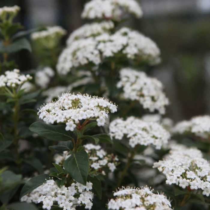 Viburnum tinus Eve Price is a bushy medium evergreen shrub with oval green leaves. It has small flattened clusters of white flowers that change into blue berries in autumn.