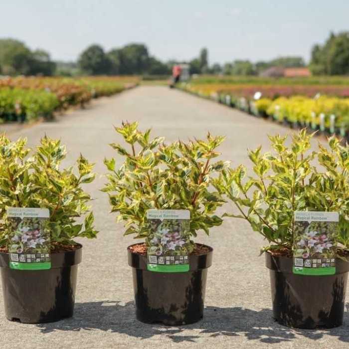 Magic by name and by nature! Red branches hold beautiful green and yellow variegated foliage that doesn’t suffer in the summer heat but flushes pink red. The tidy mounded shrub is smothered by trumpet shaped pink flowers in May and June, attracting butterflies.